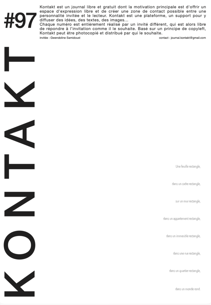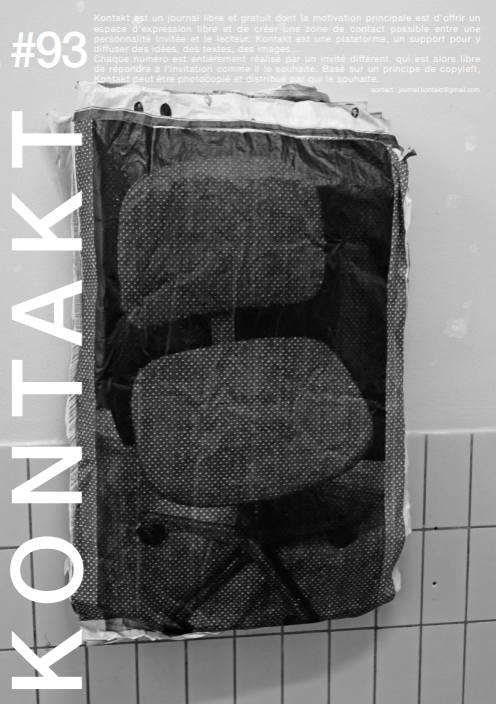 Kontakt est un journal libre et gratuit dont la motivation principale est d’offrir un espace d’expression libre et de créer une zone de contact possible entre une personnalité invitée et le lecteur. Kontakt est une plateforme, un support pour y diffuser des idées, des textes, des images…